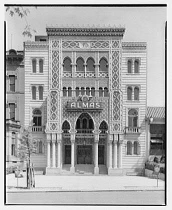 The Almas Temple is a Masonic building at 1315 K St NW in Washington, D.C. It is home to Almas Shriners, a member of Shriner’s International. The historic edifice is in the Moorish architectural style and features an elaborate, multicolored terra-coda façade. It was constructed in 1929 by Allen H. Potts, a member of the temple The building is five stories in height. It was renovated and relocated about 100 feet westward to its current location in 1987 to make way for a new office complex, On Franklin Square.